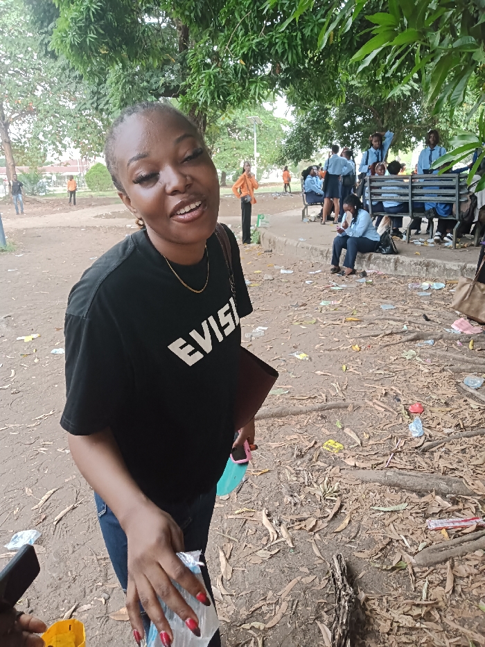 An outdoor scene in a public or campus area in Owerri, Nigeria, is depicted under a canopy of green trees. The ground is unpaved dirt, extensively covered with dry leaves and a substantial amount of litter, including plastic bottles and wrappers. In the foreground, a young Black female, approximately 20-30 years old, is positioned slightly left of center, smiling and looking directly at the camera. She has short dark hair and wears a black t-shirt with "EVISION" printed in white, dark blue jeans, and a gold chain necklace. Her fingernails are painted red. She carries a dark brown folder or bag over her left shoulder and a light blue/pink object in her left hand. Her right hand is extended towards the viewer, holding a small white plastic bag. To the right, a group of approximately ten individuals, primarily young females, are present. Most wear light blue uniform tops and dark bottoms, indicative of students. Several are seated on a green metal bench, while others stand nearby. An additional individual in an orange shirt stands further in the background. A concrete curb separates the main dirt area from the slightly raised ground where this group is situated. A solar-powered street light pole is visible behind the group. In the distant left, two individuals wearing orange shirts are partially visible, with a white building discernible beyond them. The scene is illuminated by bright natural light.