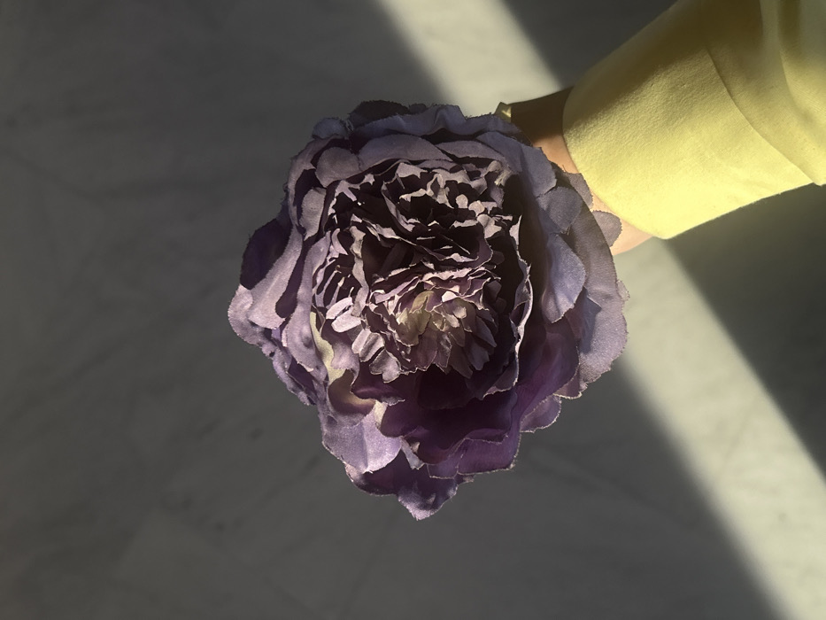 The image displays a close-up of an artificial purple flower held by a human hand. The flower, positioned centrally, features numerous layered petals in varying shades of purple and lavender, exhibiting textured detail from direct illumination. A human hand, with a yellow fabric sleeve covering the wrist and forearm, supports the flower from below. The background is a uniform, light grey, textured surface. Direct light from the upper left casts distinct diagonal shadows onto the background and creates highlights and shadows on the flower. The scene is located in Kafr Sousa Municipality, Syria.