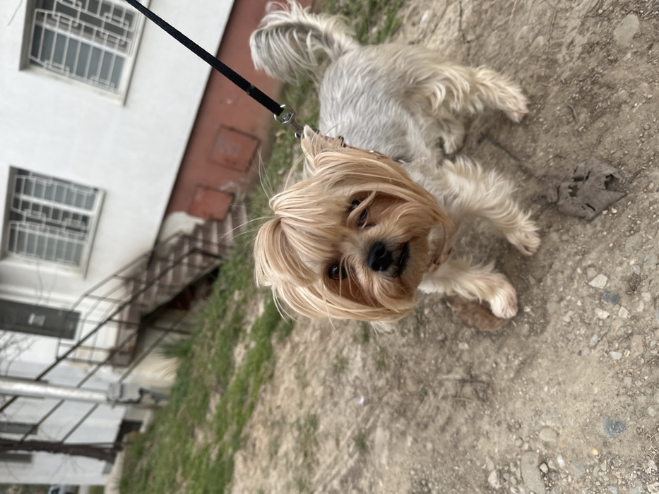 A Yorkshire Terrier, characterized by its tan head and legs, and silvery-grey body fur, stands on a dirt path with scattered small stones and dry leaves, looking directly forward. The dog wears a light-colored collar to which a black leash, secured by a silver clip, is attached and extends upwards out of the frame to the right. In the background, a white multi-story building is visible, featuring multiple rectangular windows fitted with white horizontal security bars. Below the windows, a section of the building's facade is reddish-brown. To the left of the building, a set of dark-colored outdoor stairs with metal railings descends. The ground behind the dog and leading up to the building is covered in sparse green grass and bare earth. A tree trunk without foliage is partially visible in the far-left background. The scene is located in the city of Lovech, Bulgaria.