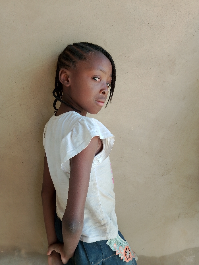 A young individual with dark skin and black cornrow-style braids, approximately waist-up, stands angled towards the right, looking back over their left shoulder directly at the viewer