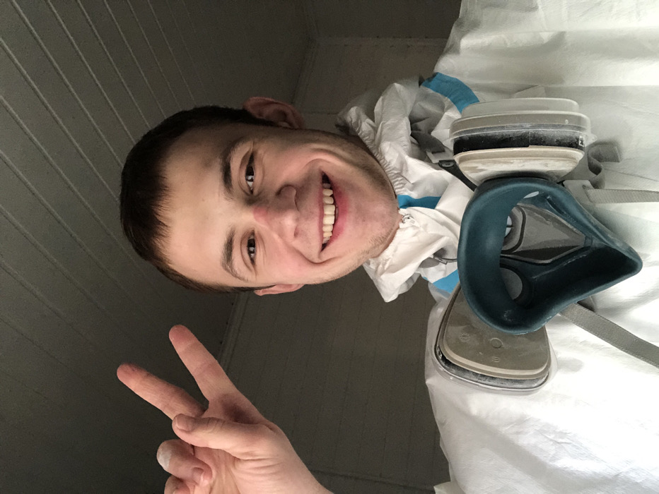 A male individual with short dark hair, estimated to be a young adult, is depicted indoors in Starokorsunskaya, Russia. He is smiling broadly, revealing teeth, and exhibits a red mark on the bridge of his nose. His left hand is raised, forming a "V" shape with the index and middle fingers, which appear to have white residue on the tips. He is wearing a white disposable protective coverall, possibly featuring light blue accents near the collar. A dark teal/green respirator mask, equipped with two filter cartridges that show signs of dust or residue, hangs around his neck by grey straps. The background is indistinct, consisting of a light-colored surface, with horizontal paneling visible in the upper portion of the frame, suggestive of a ceiling or upper wall structure.