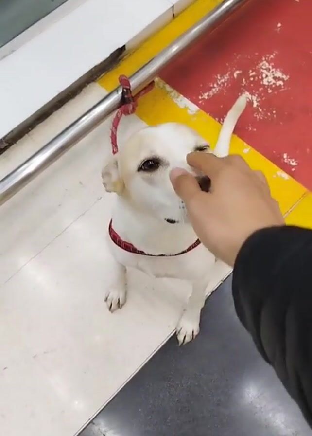 A medium shot captures a person petting a white and light-brown dog indoors. The dog, which is wearing a red harness and attached to a leash tied around a metal bar near the ground, is sitting on a floor with sections of white tile, dark gray, and a background area of red and yellow. The person is wearing a dark-colored jacket. The person’s right hand is petting the dog's neck, and the dog is looking up at the person with its eyes partially closed in enjoyment. Behind the dog and the metal bar is a large pane of glass, reflecting some items that are mostly out of view.