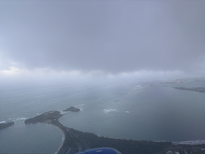 An aerial shot reveals a coastline under a heavy, overcast sky. A large body of water meets land in a semi-circular bay. A strip of land extends into the water, connected to a small island. Whitecaps dot the water's surface, and a blurred city skyline is visible in the distance. The lighting is muted, suggesting a gloomy or stormy day. A glimpse of the aircraft is visible in the lower right.