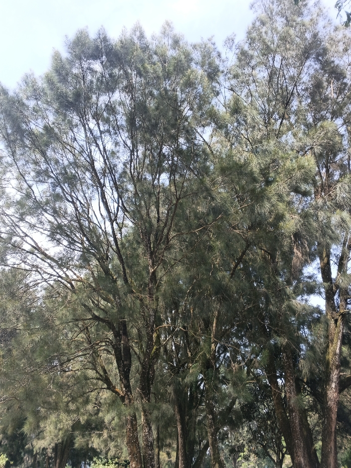 Several tall, thin trees with dense, feathery foliage fill the frame