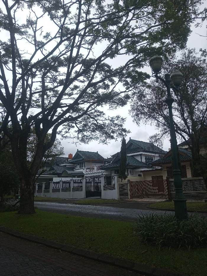 The scene depicts a residential street in Babaliya Mal., India, under an overcast sky. In the foreground, a large, dark-trunked tree with extensive, branching canopy occupies the left, partially obscuring the sky. A patterned brick pathway borders a strip of green grass, which abuts a dark, wet-appearing paved road running horizontally across the midground. On the right, a dark green ornate street lamp post with two decorative lanterns extends upwards, with dark green foliage at its base. Across the road, multiple detached houses are visible behind white perimeter walls with dark horizontal railings and black or brown metal gates. The houses feature multi-tiered, steeply sloped roofs predominantly in dark teal, with some white or light-colored facades. One house in the background displays a distinctive orange roof tile structure. No individuals or vehicles are present.