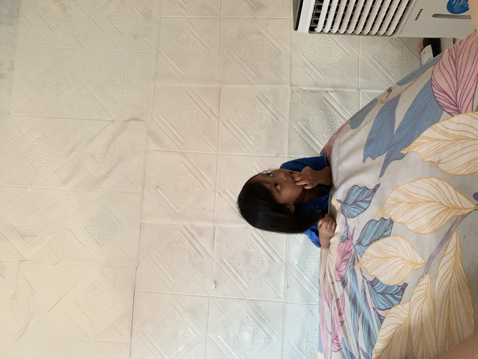 A young girl with dark hair wearing a blue shirt is lying on a bed covered with a leaf-patterned sheet. She has her fingers near her mouth. A white-tiled floor with a patterned design covers the left side of the frame, and a white air purifier is situated in the upper right corner, next to the bed.