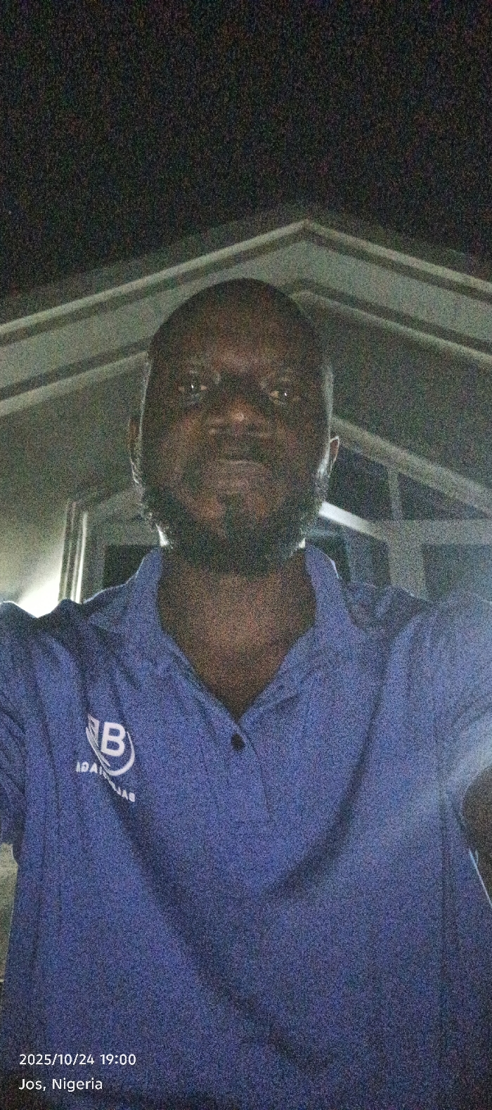 A dark-skinned adult male with a beard and short dark hair is depicted in a front-facing, waist-up portrait taken in low-light conditions. He is wearing a blue collared polo shirt with two visible dark buttons on the placket. A white, circular logo is present on the left chest area (viewer's right), featuring a stylized 'B' and partially visible, reversed text "IDAIJAS" below it. His eyes are open and directed towards the camera. The background consists of dark, indistinct areas above and behind the subject, with visible light-colored, angled structural beams or framework suggesting an indoor or covered outdoor setting. The image exhibits significant digital noise, characteristic of low-light photography. The timestamp overlaid on the image indicates 2025/10/24 19:00, and the location is specified as Jos, Nigeria.