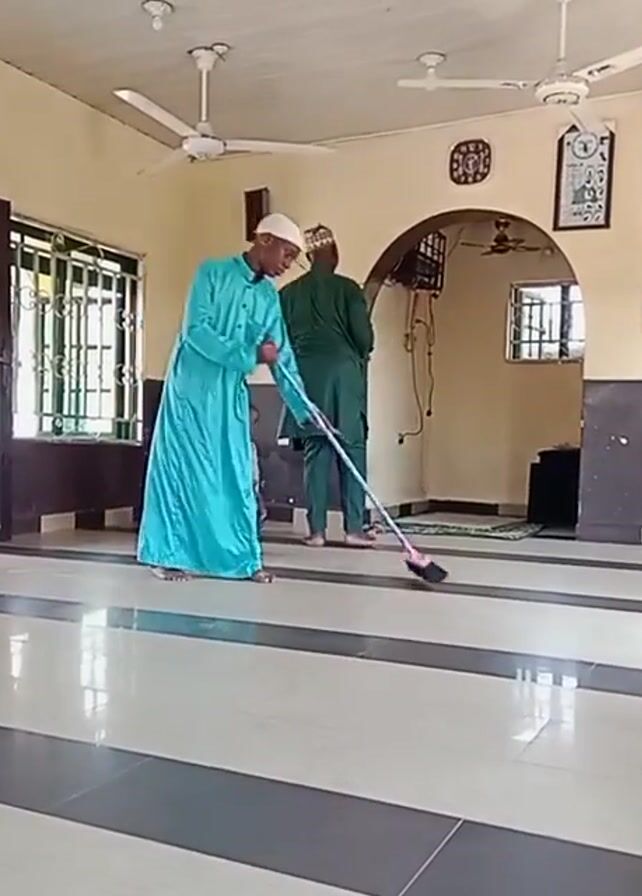 interior of a mosque. A man in a light blue robe and white cap is sweeping the floor with a broom. A young child stands near him, and another man in a green outfit stands in the background. The floor is tiled with black and white stripes. There are windows along the left wall and ceiling fans. Another man is praying on a green rug in the background. There are several pictures on the wall near an archway.