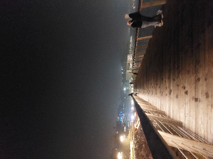 A nighttime view of a pier extending into a dark body of water. City lights are visible along the distant shore. A person stands at the end of the pier, facing away from the viewer with arms raised. The pier itself is constructed of wood and features railings along the side. The lighting is dim, with the pier surface reflecting some of the surrounding light.