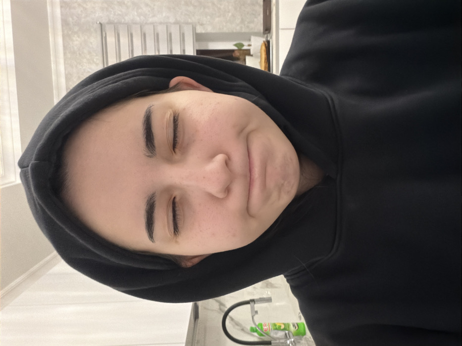A close-up captures a person wearing a black hoodie with the hood pulled up. Eyes are closed, and the face displays a slight pout. Light skin is visible with a few freckles. The background is a blurred interior setting with light-colored walls and furniture. A kitchen faucet and cleaning supplies are partially visible in the lower portion. The image is rotated, appearing to be taken from a tilted angle.