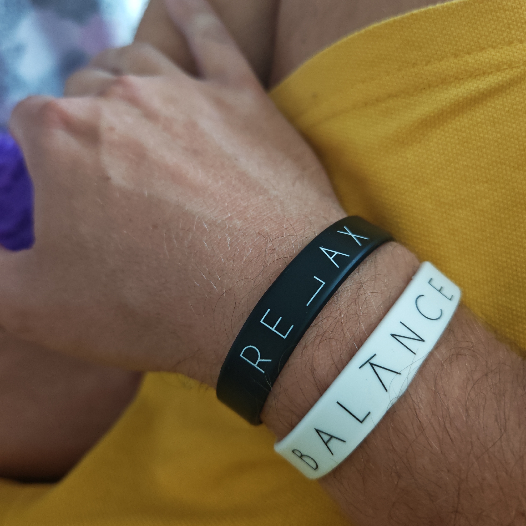 A close-up shot shows a person's forearm, adorned with two wristbands. The upper wristband is black with the word "RELAX" in white lettering, where the "A" is stylized with an inverted "V". Below it, a white wristband displays the word "BALANCE" in black lettering, also with an inverted "V" for the "A". The person appears to be wearing a yellow garment. The location in the city of Rostov, Russia is not discernable from this image.