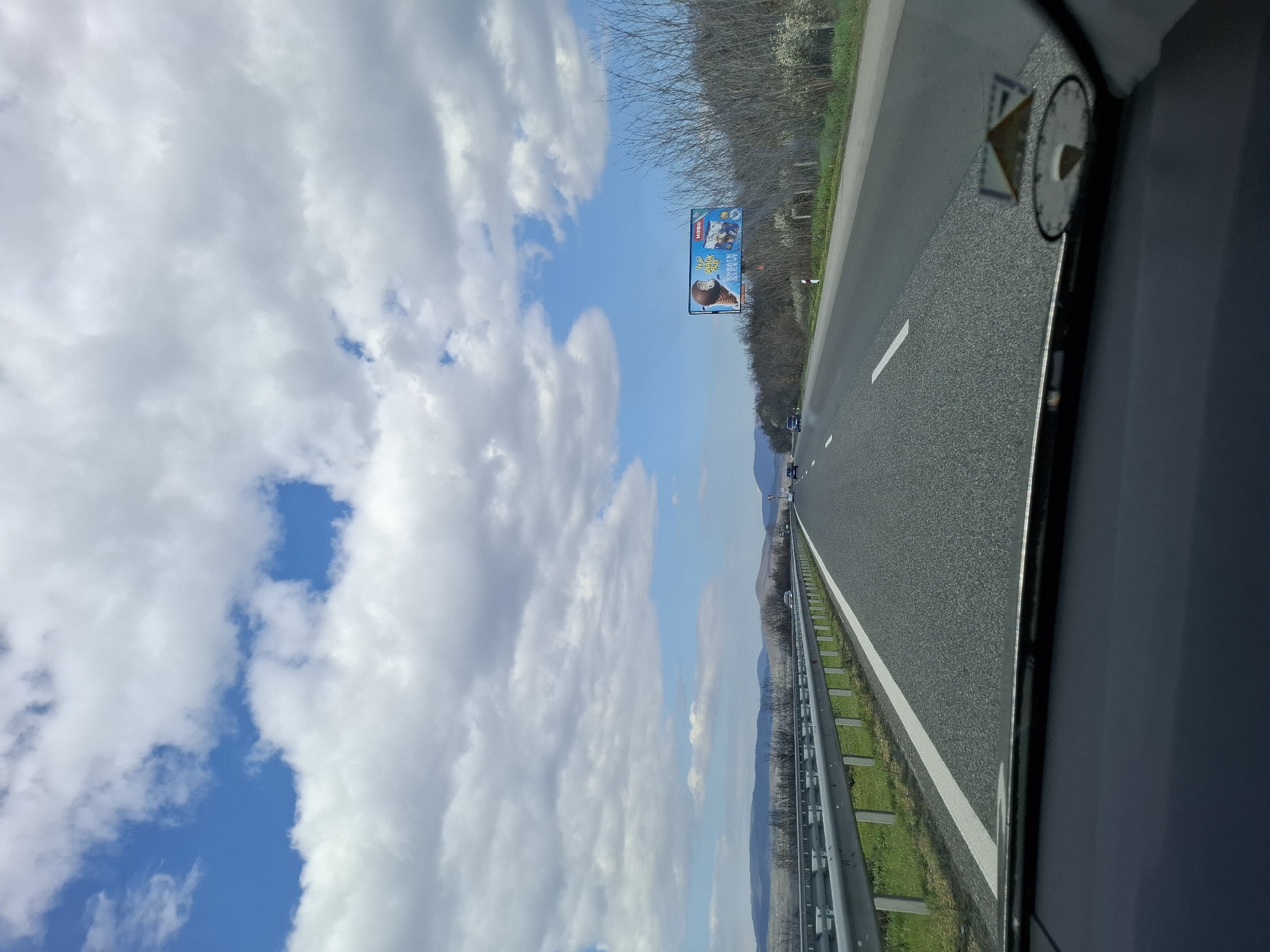 view from inside a car driving on a highway. The sky is predominantly blue with white cumulus clouds. On the right, the highway stretches into the distance with a white line separating the lanes. A roadside guardrail is visible. A billboard featuring an ice cream product is located along the highway. The location appears to be near Kalugerovo, Bulgaria, based on the billboard advertisement.