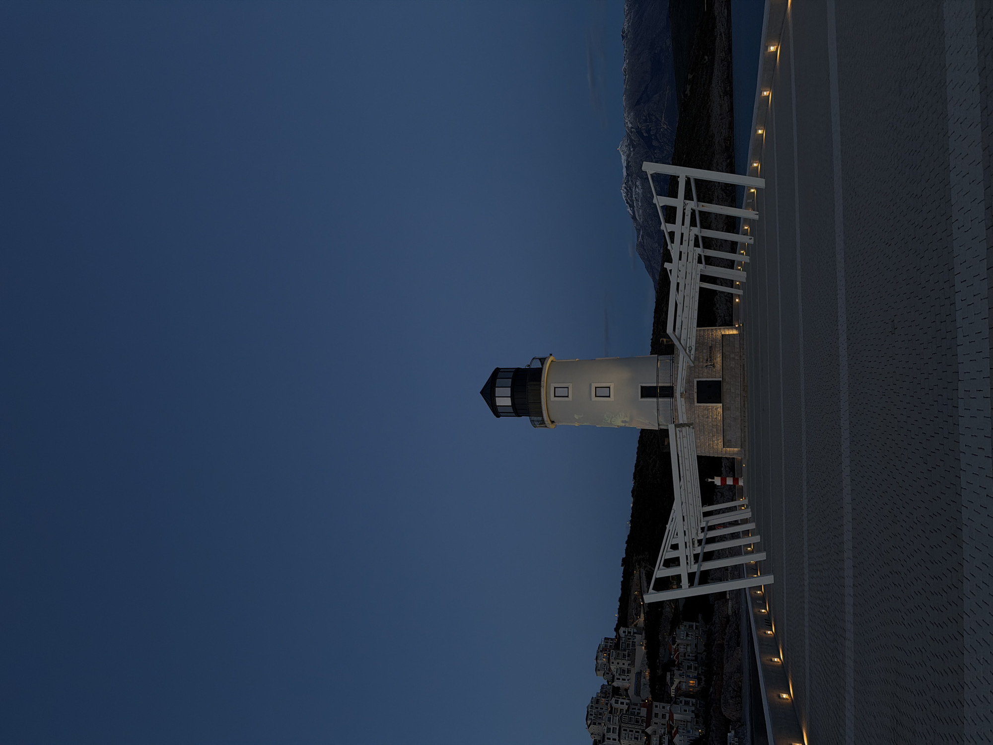 lighthouse in the city of Radovići, Montenegro, taken at dusk or dawn. The sky is a deep blue. The lighthouse is white with a black top section, and is lit up. It stands on a paved area with white metal supports. Below the lighthouse and to the right is a settlement of white buildings. In the distance, a mountain range can be seen. The perspective of the image is rotated.