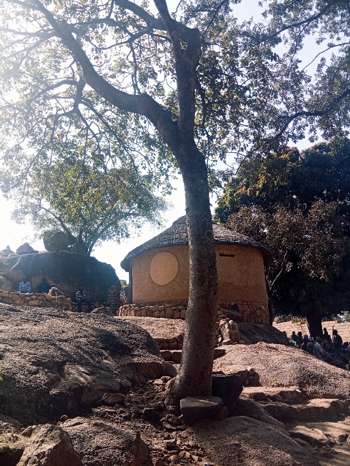 The image displays an outdoor scene in Jos, Nigeria, characterized by rocky terrain, traditional architecture, and substantial tree cover under bright daylight