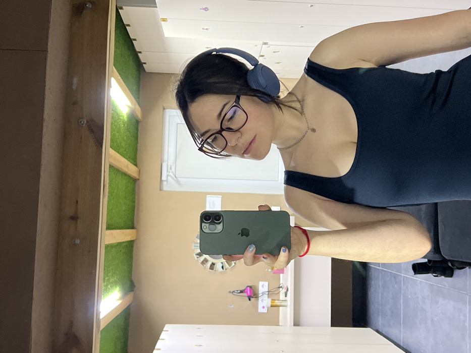 A female individual is depicted in a mirror selfie taken within what appears to be a changing or locker room in Lymanka, Ukraine. The subject, visible from the upper torso, wears a dark tank top, dark-rimmed glasses, and blue over-ear headphones. A silver chain with a small pendant is around her neck, and a red string bracelet is on her left wrist. Her fingernails are painted light blue. She holds a dark green smartphone, featuring an Apple logo, in her right hand, positioned to capture her reflection. Her head is tilted slightly, and her eyes are partially closed. The background, reflected in the mirror, reveals a ceiling constructed with dark wooden beams interspersed with sections of artificial green turf. Light beige walls are visible, alongside a row of light-colored lockers with small dark handles on the right. To the left, a light-colored counter holds a pink hairdryer hanging on the wall, various bottles, and a round, silver-framed decorative wall mirror. A white door with a window pane is visible in the background. The floor consists of large, dark square tiles, with a dark object, possibly footwear, and a dark bench partially visible in the lower left.