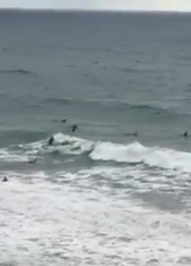 The scene shows a wide ocean view from a slightly elevated position. Multiple surfers are scattered throughout the water, some paddling and others riding waves. Waves are breaking closer to the shore with white foam. A red flag is visible on the beach to the left of the frame. The sky is overcast, creating a muted, greyish light across the scene.