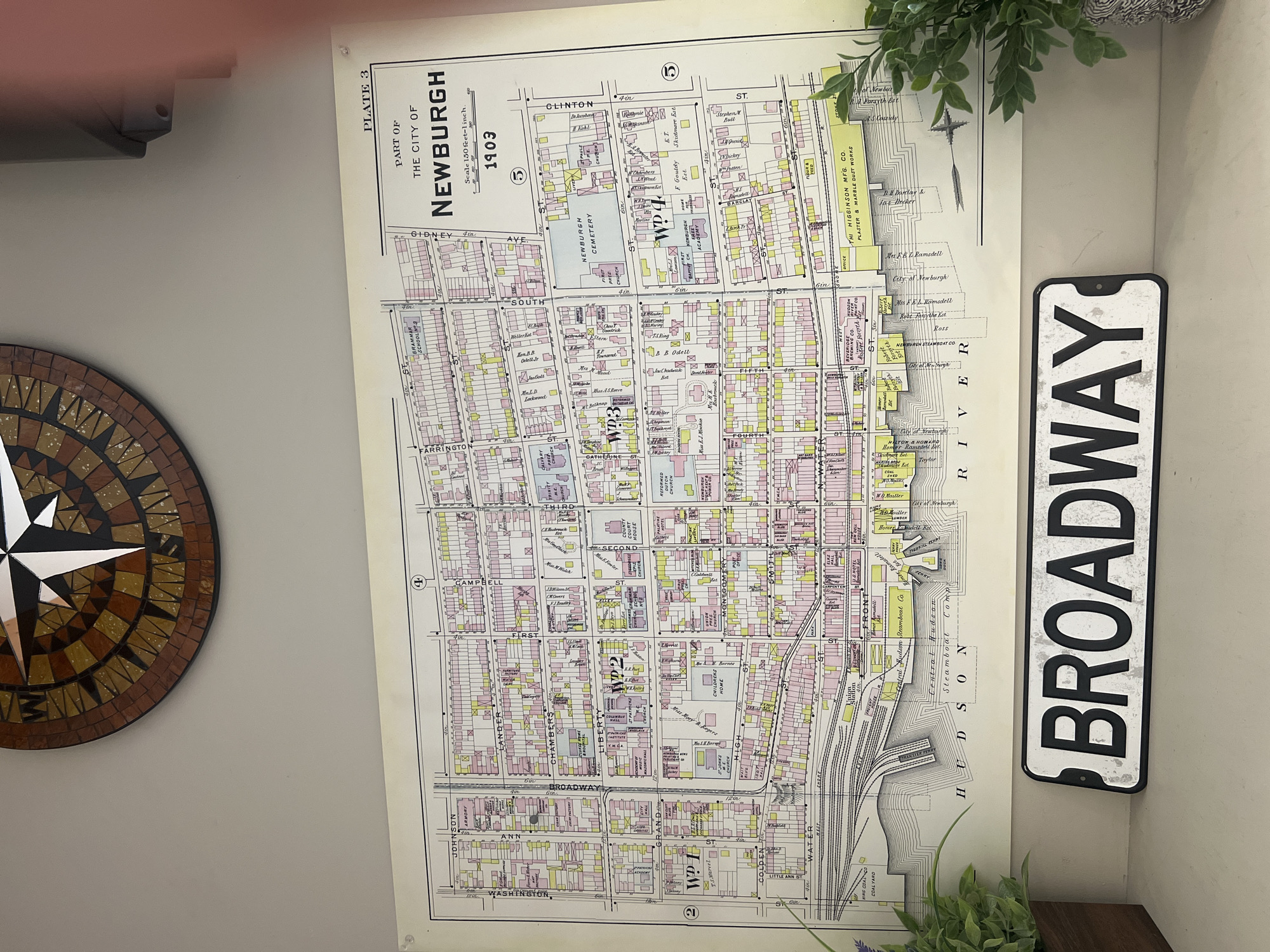 The image displays a wall-mounted historical map titled "PART OF THE CITY OF NEWBURGH" dated "1903," centered on a light-colored wall
