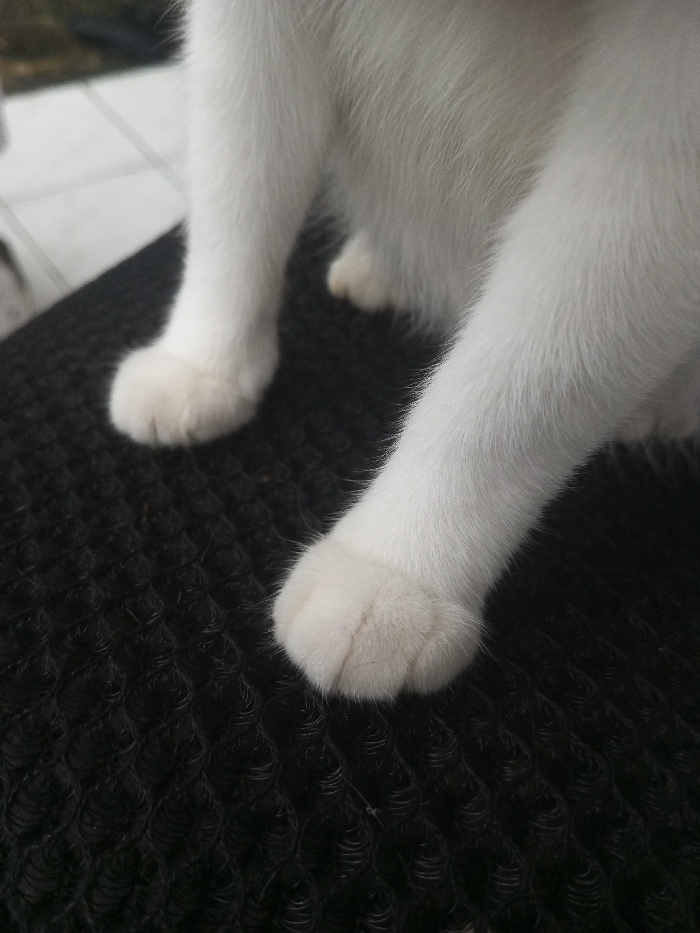 A forensic description of the scene in Ura-Dozhi, Bhutan, reveals the lower extremities of a white domestic cat. Three white-furred paws and portions of the animal's lower legs are visible, positioned on a dark, heavily textured surface. This surface appears to be a black, woven fabric, possibly a mat or upholstery, characterized by uniform, tightly packed loops. The cat's fur is short and clean. In the blurred background, a lighter, indistinct surface is visible, possibly a floor or another indoor element. No other individuals, actions, or objects are discernible in the frame.