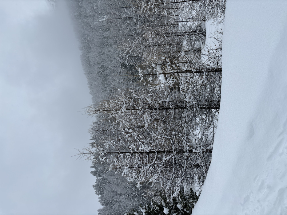 snow-covered forest in Pontresina, Switzerland. The trees are mostly coniferous and are covered in a layer of fresh snow. The sky is overcast and there is a thick layer of fog in the distance. The scene is quiet and peaceful, with no people or animals visible. The ground is covered in a thick layer of snow. The trees are bare and the branches are covered in snow. The fog is thick and obscures the distant mountains. The image was likely taken on a cold, winter day.