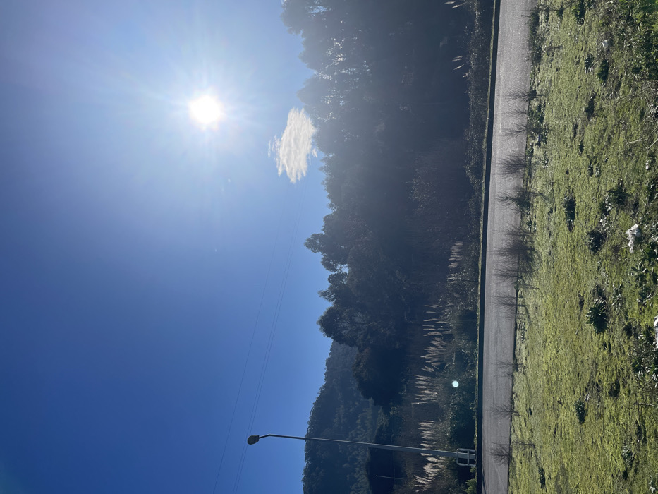 This image depicts a sunny outdoor scene in Barcelos, Portugal, characterized by natural vegetation and a paved road under a clear sky. The upper portion of the frame is dominated by a bright blue sky, with the sun prominently visible in the upper right quadrant, emitting a strong starburst lens flare. A single, small, white cumulus cloud is present to the lower left of the sun. Below the sky, a distant range of dark green, densely forested hills or mountains forms the backdrop, sloping downwards from left to right. In the midground, a dense treeline, consisting primarily of tall, slender dark green trees, runs horizontally across the frame, obscuring the lower portions of the distant hills. A paved, asphalt road curves through the scene, entering from the lower left and moving towards the upper right, rising slightly. Alongside the left edge of this road, a large cluster of tall, feathery, light-colored ornamental grass, possibly Pampas grass, stands out. A modern street lamp with a dark pole and a horizontal fixture is positioned on the left side, near the road, with its base featuring a light-colored rectangular structure. Two thin, dark horizontal lines, likely power or telephone wires, traverse the sky from the vicinity of the street lamp towards the right. The foreground consists of an uneven grassy area, predominantly mossy green, with scattered patches of bare earth. Several small, leafless saplings or bushes are sparsely distributed across this grassy expanse. Some white refuse is visible on the ground in the lower right corner. No individuals, vehicles, or animals are present. The scene is illuminated by direct sunlight, casting an overall bright ambiance.