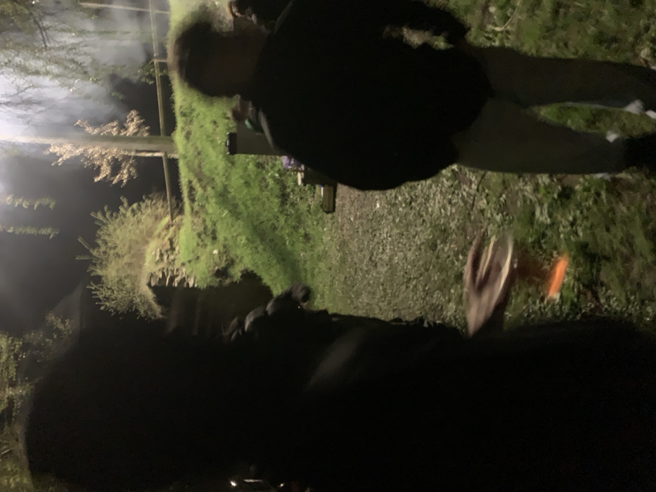 This is an outdoor nighttime scene in Macedo de Cavaleiros, Portugal, illuminated by artificial light. In the immediate foreground on the left, a dark, largely silhouetted and out-of-focus human figure is visible. A right hand, blurred by motion, extends from this figure, holding a clear glass containing an amber liquid. To the right of the frame, a second human figure stands, viewed from behind, wearing a dark top and light-colored trousers; this figure's head is blurred. The ground beneath the figures consists of a gravel path transitioning to an area of vibrant green grass, both illuminated. In the midground, a dark object resembling a cooler or small cabinet rests on the grass. The background features a grassy incline with a low stone structure partially covered by vegetation. Several trees are present, including one with bare branches, and smaller bushes. A plume of white smoke or mist rises from the right background, partially obscuring vegetation. A dark, indistinct building is faintly visible in the far left background.
