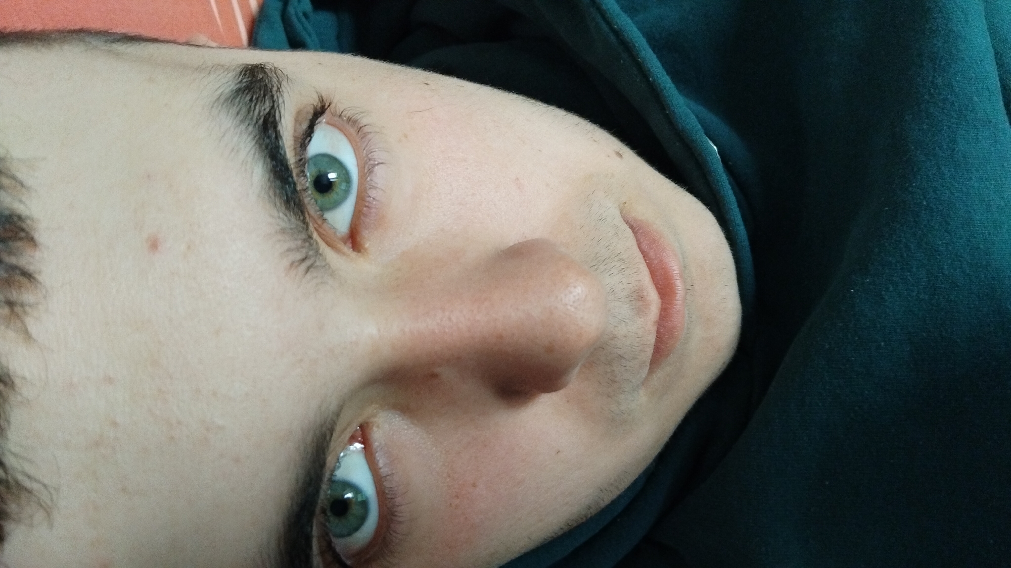This image is a high-angle, close-up portrait of an individual's upper face, taken in the city of Troyan, Bulgaria. The subject has fair skin, with visible pores and minor irregularities, including small moles or freckles on the forehead and cheeks. Their prominent irises are green, with visible pupils reflecting a light source. Dark, dense eyebrows are situated above the eyes. Short, dark hair is visible at the top of the forehead. Sparse stubble is present on the upper lip and chin area. The individual's lips are closed and appear naturally pigmented. They are wearing a dark teal-colored hooded garment, a portion of which is visible around the right side of the face and covers the lower portion of the frame. The background is largely indistinct, with a subtle reddish-orange area visible in the upper right quadrant, suggesting an indoor setting.