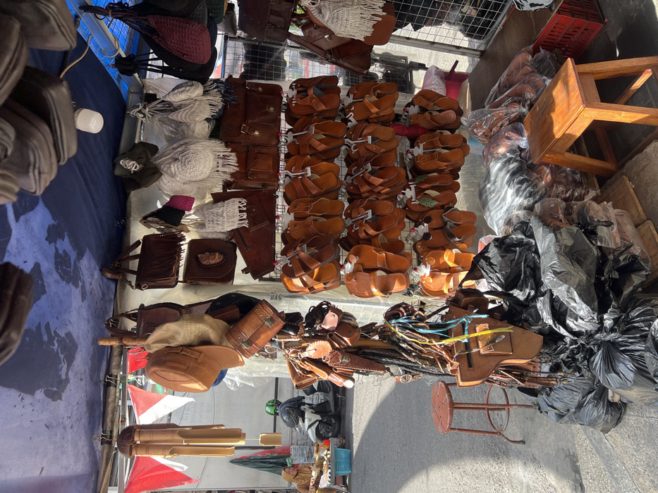 A market stall displays various leather goods: sandals, purses, and bags