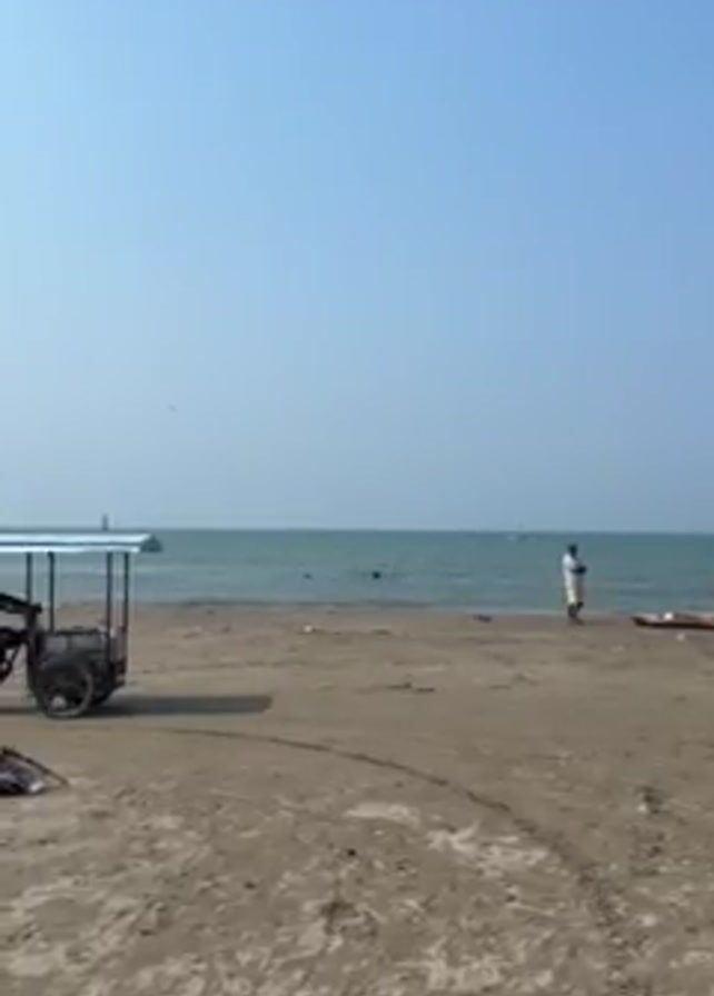 beach with a clear blue sky and calm ocean. There are a few people visible: one man standing near the water, one walking across the sand carrying a white plastic bag, and a person driving a motorized cart with a light blue canopy attached. The cart passes from right to left across the frame. There is tire tracks visible in the sand.