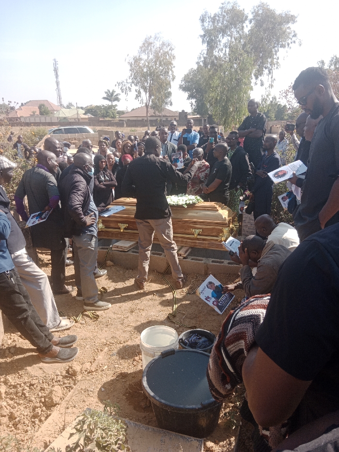 A burial ceremony is underway in an open, dusty area in Gura Top, Nigeria, under a clear, bright sky