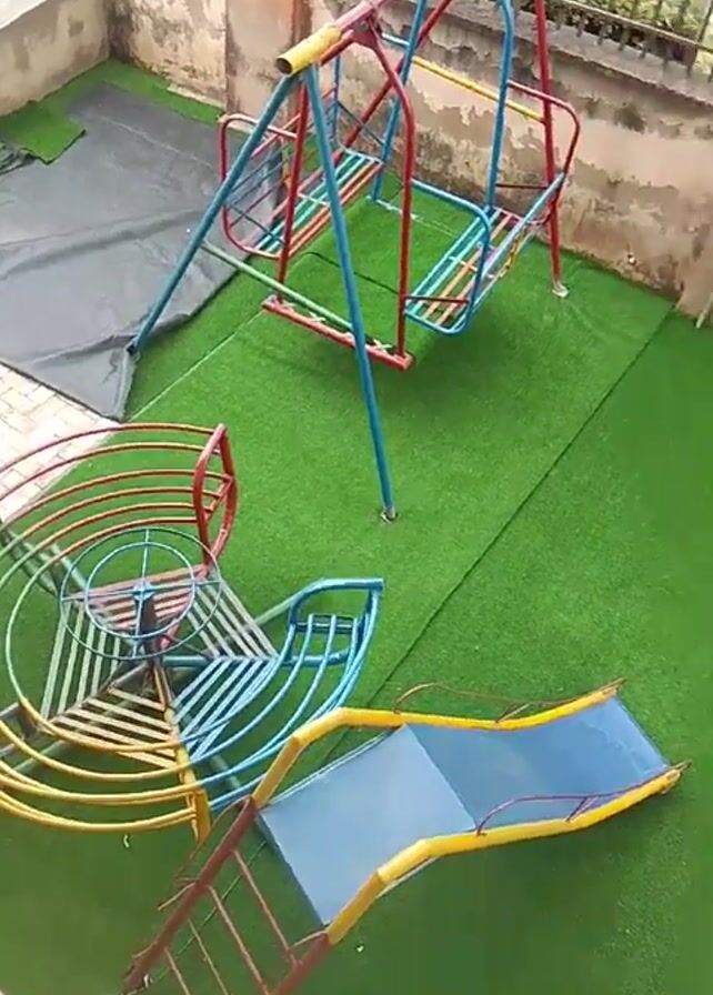 small playground area with artificial green turf. The playground equipment includes a swing set, a slide with a ladder, a merry-go-round, and a pile of small, overturned chairs. The equipment is constructed of metal and painted in bright colors like red, blue, yellow, and green. A dark grey tarp is visible in one corner of the playground. A fence is visible on top of a short wall. The shot is taken from above.