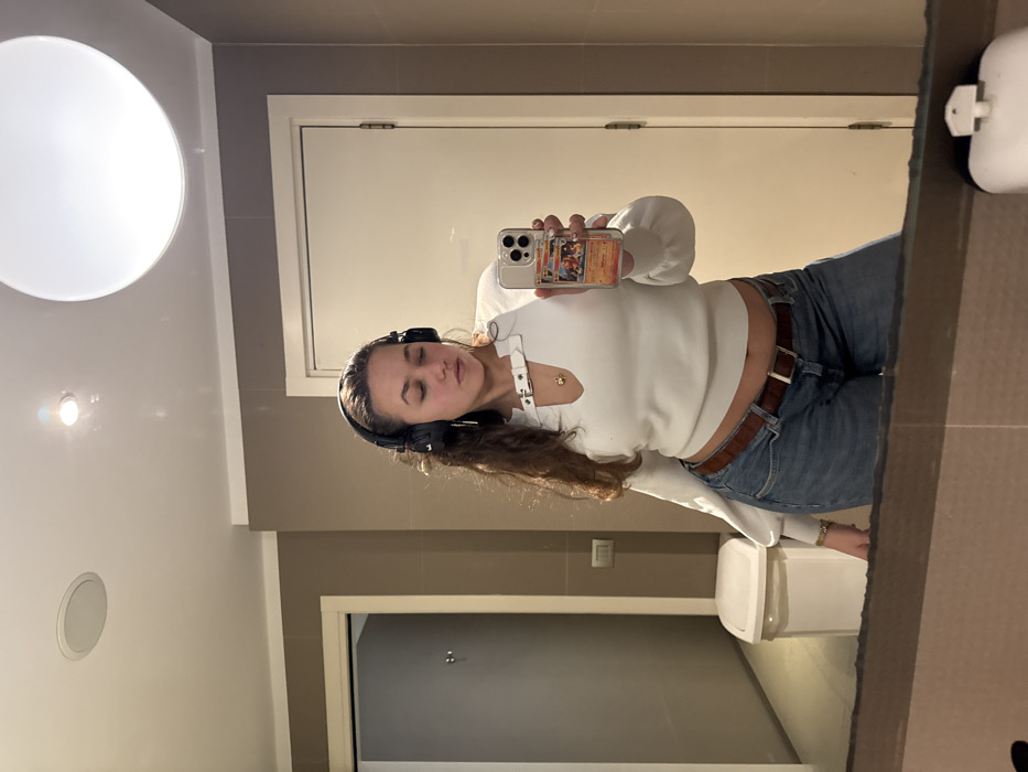 This image, captured in Milan, Italy, displays the reflection of a female individual in a mirror within an indoor environment. The subject has long, dark, wavy hair and wears black over-ear headphones. Her attire consists of a white long-sleeved top featuring a keyhole cutout and a decorative buckle at the neckline, below which a small gold-colored pendant is visible. She also wears blue denim jeans secured by a brown leather belt. A gold-colored ring is present on her left ring finger, and a gold-banded watch on her left wrist. She holds a smartphone in a clear case, with a Pokémon Charizard card positioned behind the phone, pointing it towards the mirror to capture her reflection. Her gaze is directed downwards towards the device. The background features light brown/taupe walls, a white ceiling with two recessed circular lights and one large, round flush-mount light fixture. To the left, an open doorway leads to a darker area, and a white lidded trash can is visible near the entrance. To the right, a closed white door is visible. The lower edge of the mirror reveals a dark surface and a white dispenser-like object.