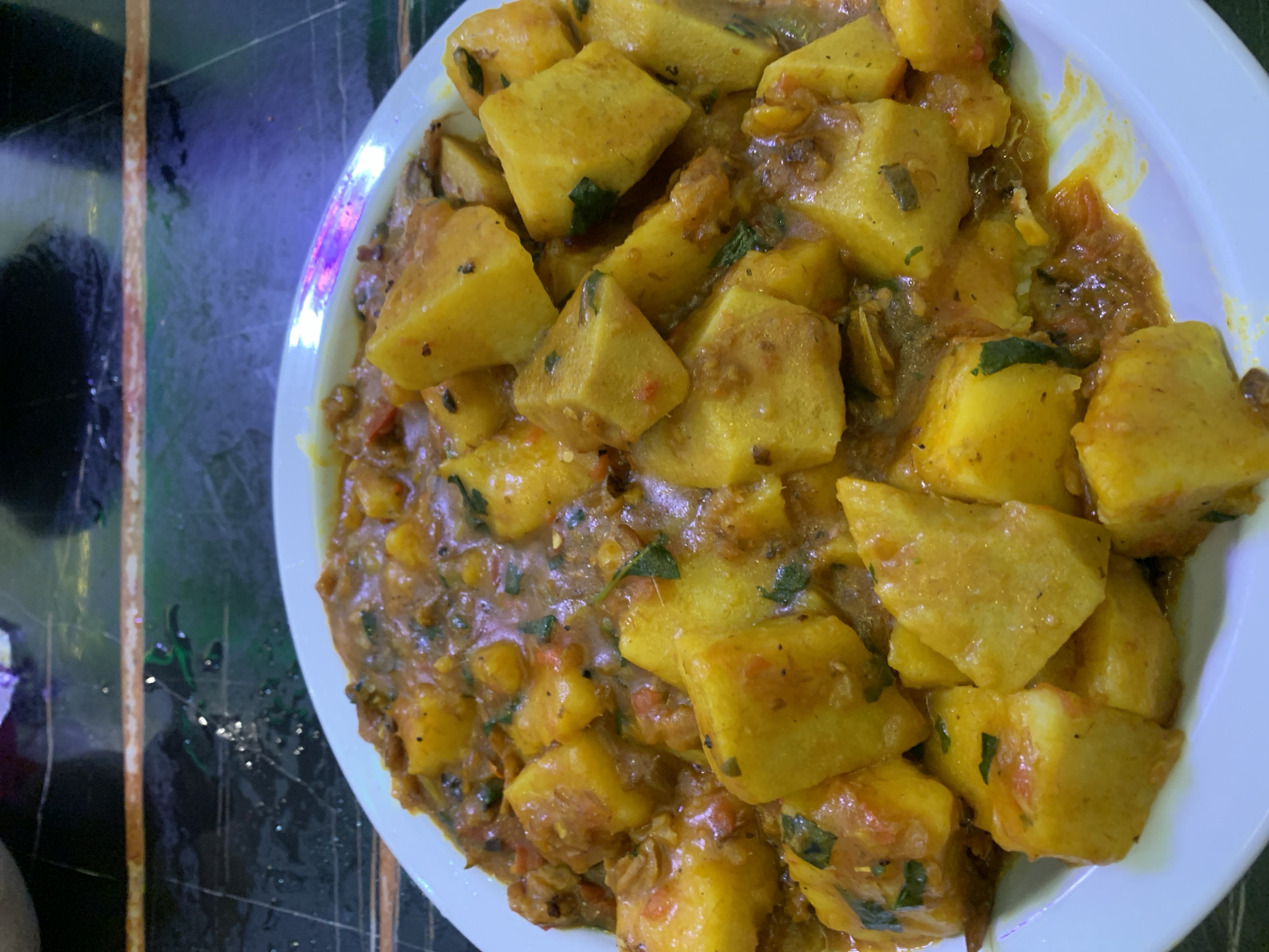 - "A top-down shot shows a white plate filled with cubed, yellow potatoes in a sauce with visible green herbs" by FM-xJZuN2, licensed under CC BY 4.0