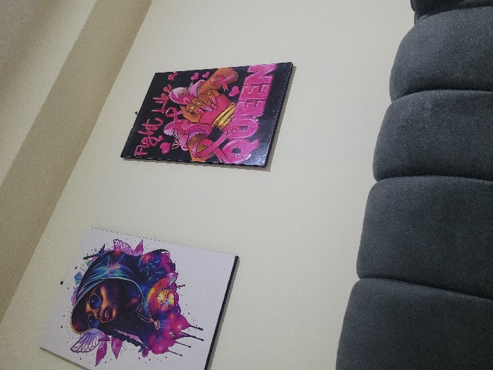 This image depicts an indoor scene in Nanyuki, Kenya, showing a section of a light-colored wall with two framed artworks mounted above a dark grey sofa. The upper portion of the sofa, specifically three distinct back cushions, is visible at the bottom of the frame. A ceiling beam is partially visible along the top edge of the image. The artwork on the left is a vertical rectangular poster featuring a stylized illustration of a person, likely female, with dark skin, wearing a cap and sunglasses, looking upwards. This illustration is rendered in vibrant shades of purple, blue, and pink, incorporating floral elements, wing-like details, and a watercolor-like drip effect. The artwork on the right, smaller and also vertically oriented, is a poster with a black border. It displays the phrase "Fight Like a QUEEN" in prominent pink lettering against a black background, surrounded by pink hearts, ribbons, and elements resembling boxing gloves.