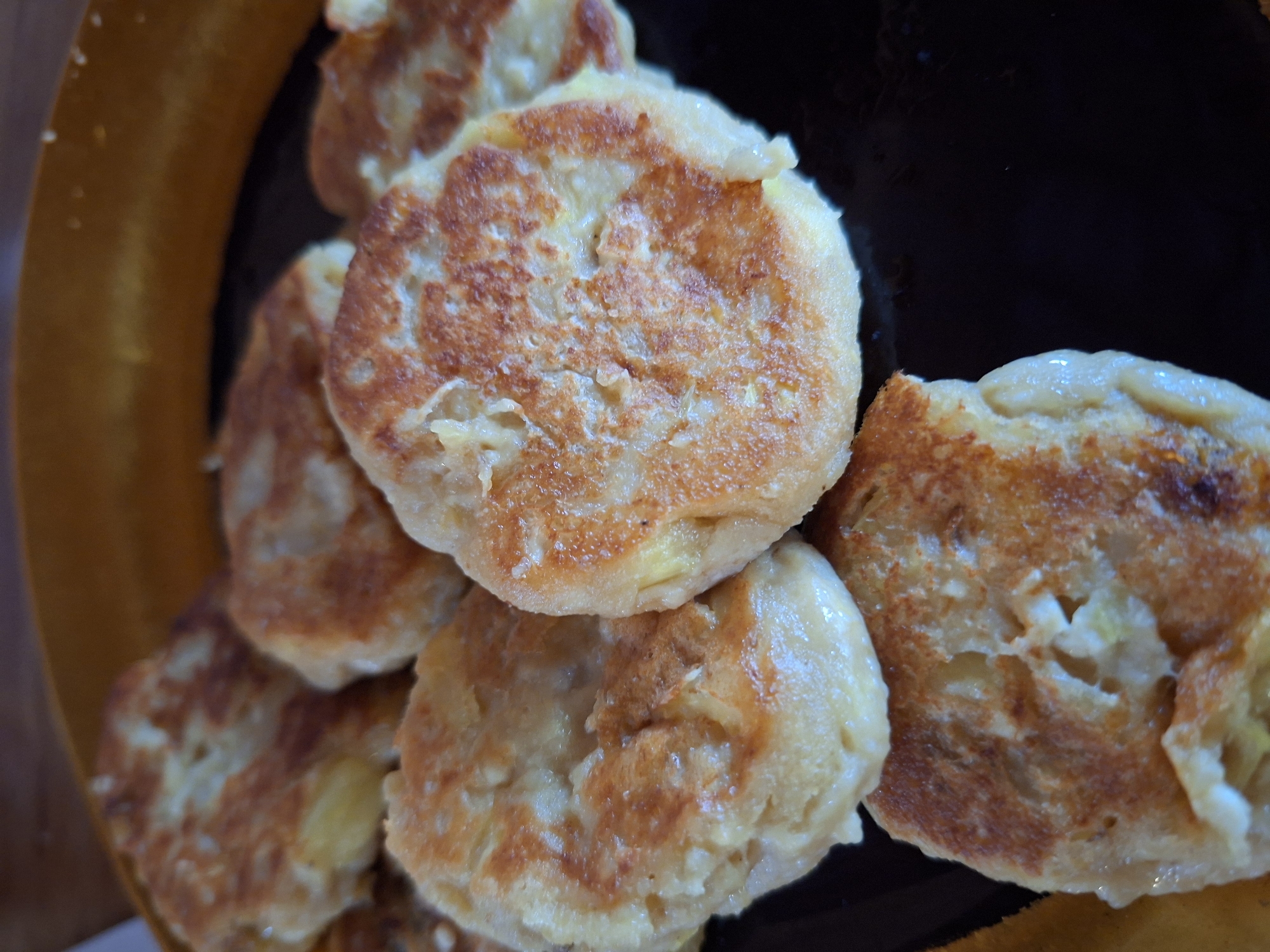 - "A close-up shot shows a cluster of small, round, golden-brown potato pancakes arranged in a dark brown bowl with a tan rim" by FM-mj2OH3, licensed under CC BY 4.0