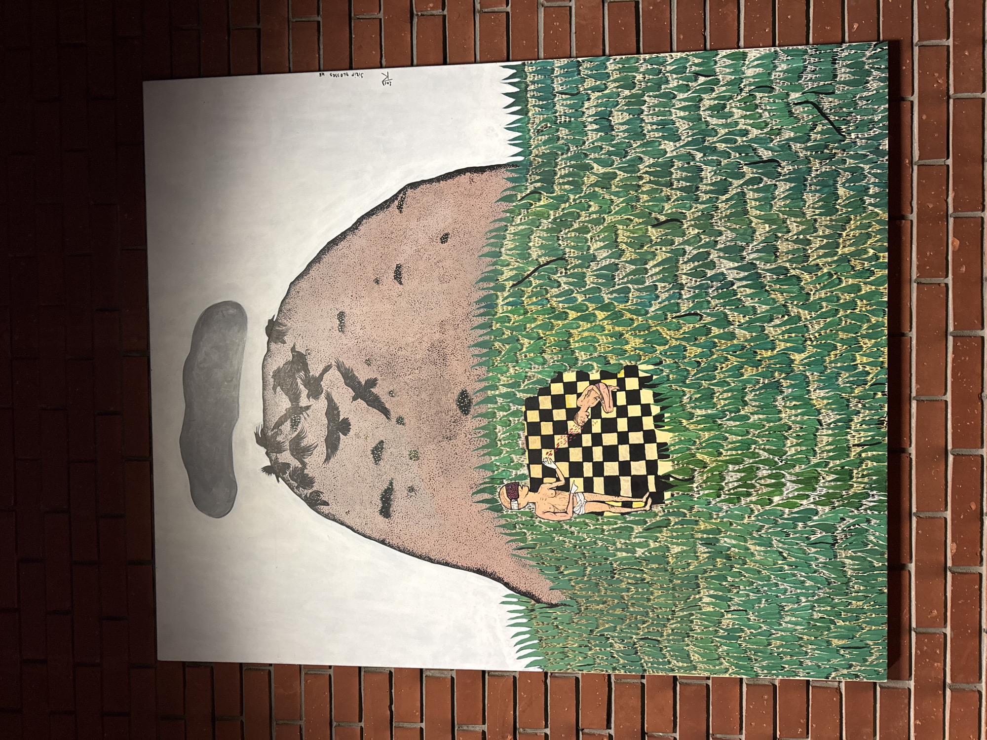 A large, rectangular painting by Jovana Banjac, titled "JIJI BLESSES ME," is displayed on a red brick interior wall at the SPENS Sports and Business Center in Novi Sad, Serbia. The artwork depicts a stylized landscape under a light grey sky, dominated by a large, textured reddish-brown hill in the upper center, topped by a dark grey cloud. Multiple black, silhouetted birds are depicted in flight or perched on the hill. The lower half of the painting is filled with dense, vertically oriented green foliage, highlighted with yellow. In the foreground, two anatomically simplified human figures, both wearing white briefs, interact on a black and yellow checkered blanket or board. One figure stands on the left, wearing a dark head-mounted display (resembling a VR headset) and holding a small, light-colored object over the board. The second figure is positioned face down on the checkered surface. The artist's inscription, "JIJI BLESSES ME," is present along the right edge of the painting.