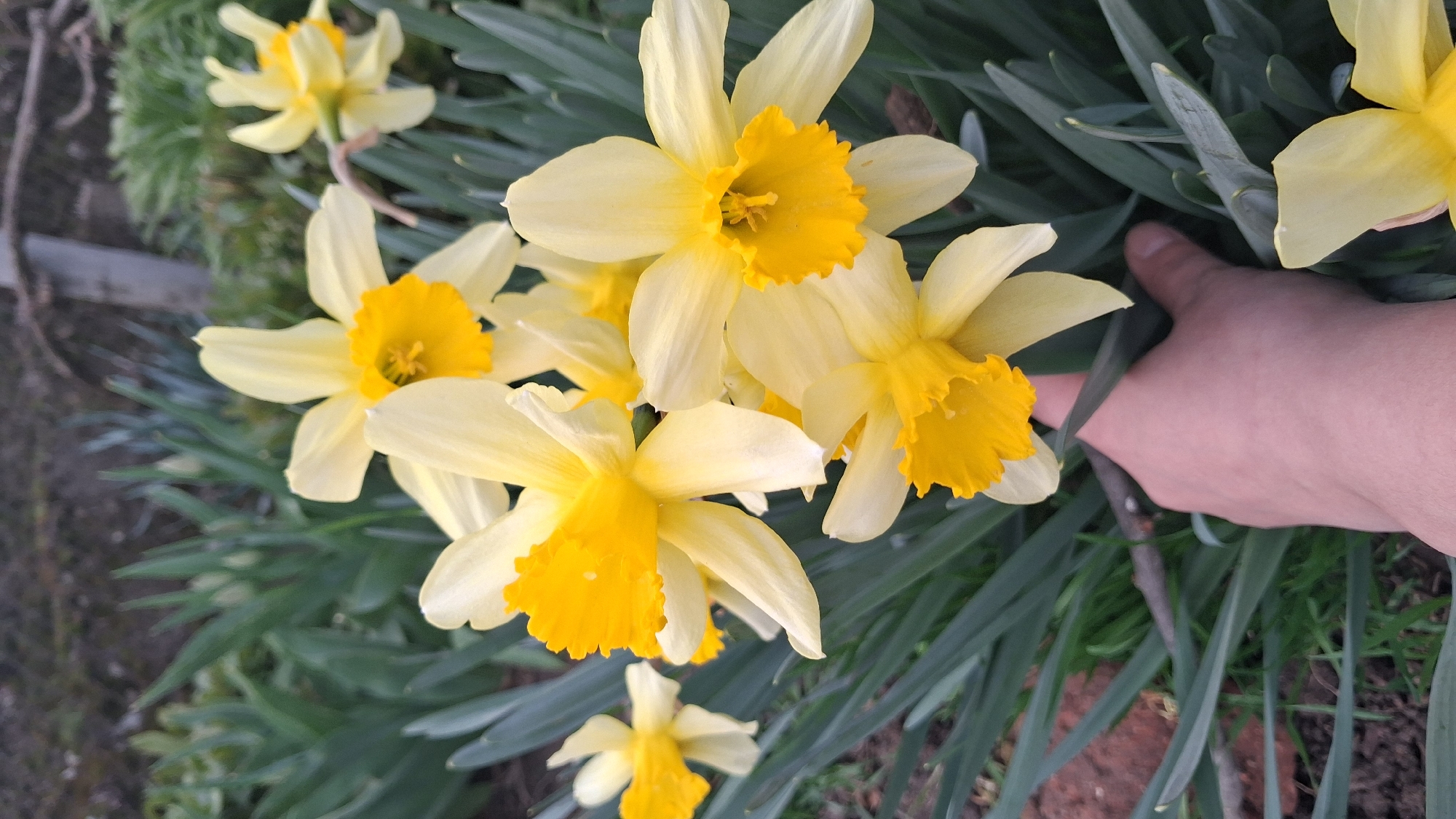 cluster of daffodils with pale yellow petals and bright yellow trumpet-shaped coronas. They are surrounded by long, thin green leaves. A human hand is partially visible in the right side of the image, seemingly reaching towards the daffodils. The setting appears to be a garden. There are no recognizable landmarks or identifying details that would indicate a precise location within Goce Delcev, Bulgaria.