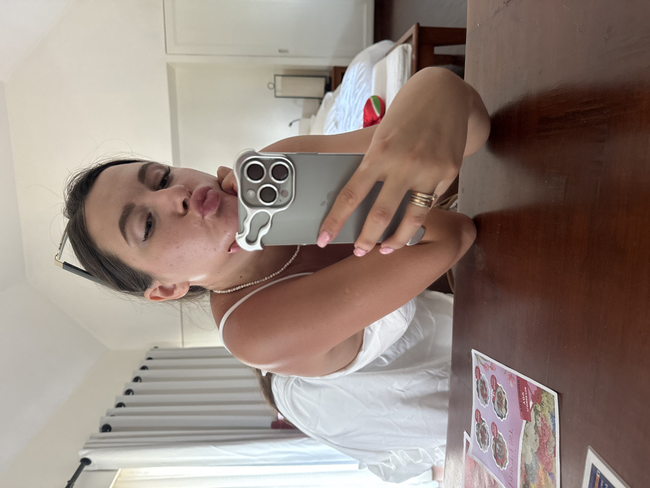A woman in a white top takes a selfie in a mirror. She's puckering her lips, and her phone, encased in a light-colored case, is held up. A small, beaded necklace adorns her neck, and rings are visible on her fingers. Sunglasses are tucked into her hair. The reflection reveals a partially visible bed and curtains. Several cards are scattered on the tabletop surface beneath her arm.