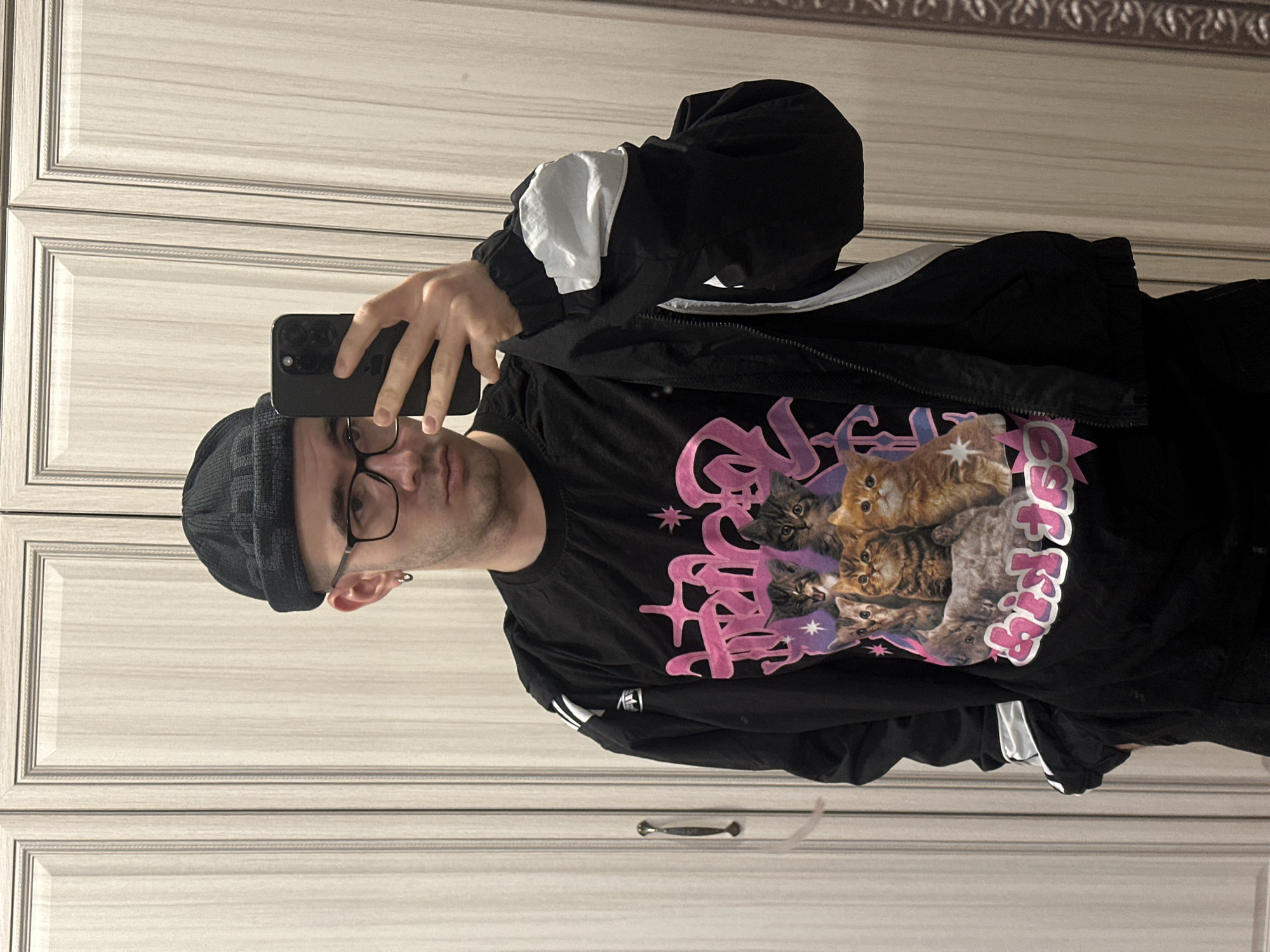 This image depicts a male individual taking a mirror selfie in an interior setting within the city of Aktanysh, Russia. The man, appearing to be in his 20s or 30s, is positioned centrally, facing his reflection. He wears a black knit beanie, black-rimmed glasses, and a silver hoop earring in his left ear. His attire includes a black long-sleeved t-shirt featuring a large graphic print of multiple kittens with pink stylized text, worn under an open black zippered jacket with white accents on the sleeves. He holds a dark-colored smartphone in his right hand, pointed towards the mirror. The background consists primarily of a light-colored wooden or laminate wardrobe or cabinet with two doors, detailed with recessed panels and decorative trim. A dark, possibly metallic, handle is visible on the left wardrobe door. A section of a decorative, dark-framed mirror border is partially visible along the right edge of the frame.