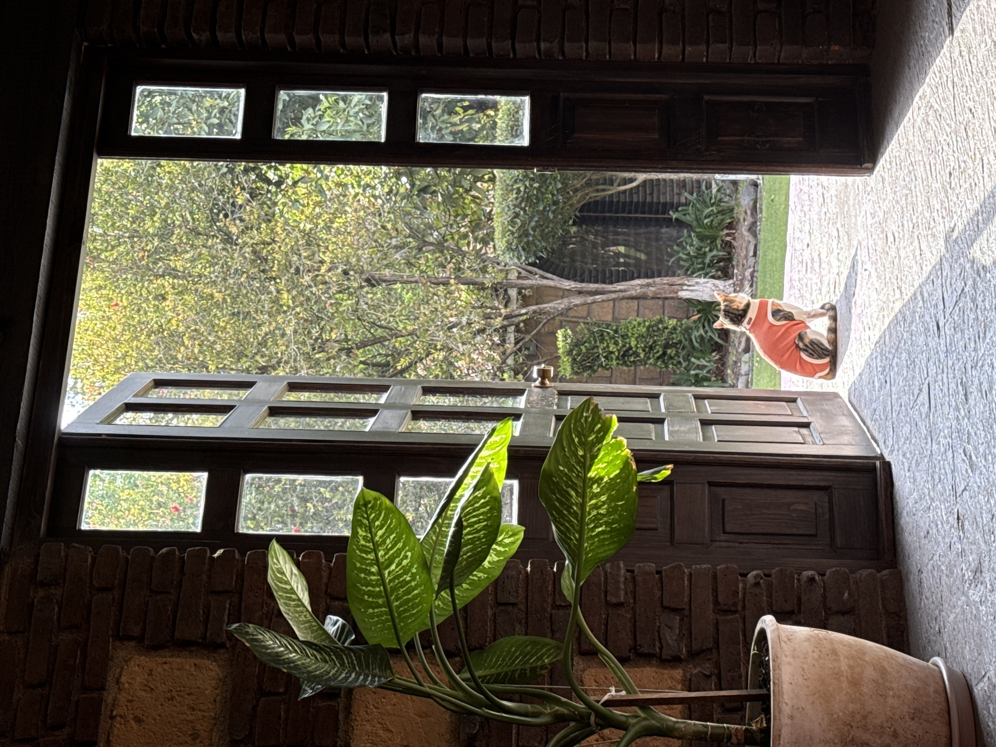 A photograph, taken indoors looking outward through a dark wood framed doorway, captures a cat wearing an orange vest standing outside on a paved area under bright sunlight. The cat, positioned on the right side of the frame, is the main subject of attention outside. The doorway opens to a green and leafy garden scene. Above the doorway, small rectangular panes of glass provide glimpses of the outside foliage. A potted plant with large green leaves is visible in the foreground, adding a natural element to the indoor space. The construction is of brick, and the doorway is of dark, old, well-worn wooden planks. The image might be taken in a rural location, possibly in Cañada de Madero, Mexico.