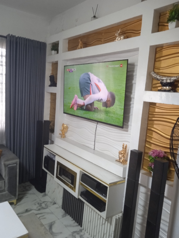 This image depicts a residential living room interior in Lagos, Nigeria. The precise location within the city is indiscernible from the visual information. The central feature is a modern, white wall-mounted entertainment unit with gold-accented recessed shelves and white textured wavy panels behind the television. A large black flat-screen television is centrally mounted, displaying a live Premier League soccer match between Manchester United and Fulham, indicated by the score "MUN 0-0 FUL" and "LIVE" text. The screen shows a male soccer player, wearing a white long-sleeved jersey, gray shorts, and pink cleats, prostrate on a green field. Below the television, a white floating media console with gold trim houses various electronic devices. Two tall, black tower speakers stand on the floor to the left and right of the media console. Decorative items on the wall unit include gold-colored figurines (e.g., a "peace" hand gesture, an abstract shape, a deer), small potted green plants, a black bust sculpture, a diffuser with reeds, and a silver and black decorative bowl. To the far left, a segment of a gray sofa with gold trim is visible, positioned in front of dark gray, floor-length pleated curtains covering a window. A white coffee table with gold trim is partially visible in the bottom left foreground. The floor is light gray and white veined marble or tile. A black standing fan and two smaller black speakers are partially visible on the far right. No individuals are present within the room.