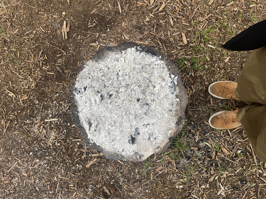 An overhead view captures an outdoor scene in the Mate Asher Regional Council, Israel. A circular, ground-level fire pit, approximately 60-70 cm in diameter, occupies the center-upper portion of the frame. It is entirely filled with a dense layer of white and light grey ash, with scattered black charcoal fragments visible within. The fire pit's edge is dark and slightly irregular. The surrounding ground consists of dark brown soil, heavily mixed with numerous light brown wood chips and small pieces of bark. Sparse green vegetation grows intermittently amidst the soil and wood chips, particularly in the lower left. A small, dark metal cup or container is partially visible on the ground to the left of the fire pit. In the foreground, the lower legs and feet of an individual are present, wearing light brown, low-top lace-up sneakers with white soles and olive green pants. A black object is partially visible to the right of the individual's right leg.