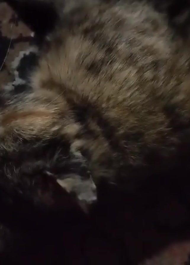 A tortoiseshell cat is lying on a dark, patterned surface. The camera is close and focused on the cat. The cat shifts slightly.