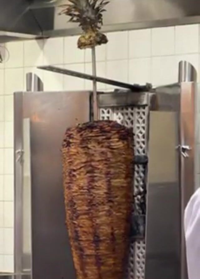 - "A large pile of cooked meat on a vertical rotisserie is shown in a kitchen setting" by FM-AJf9d2, licensed under CC BY 4.0