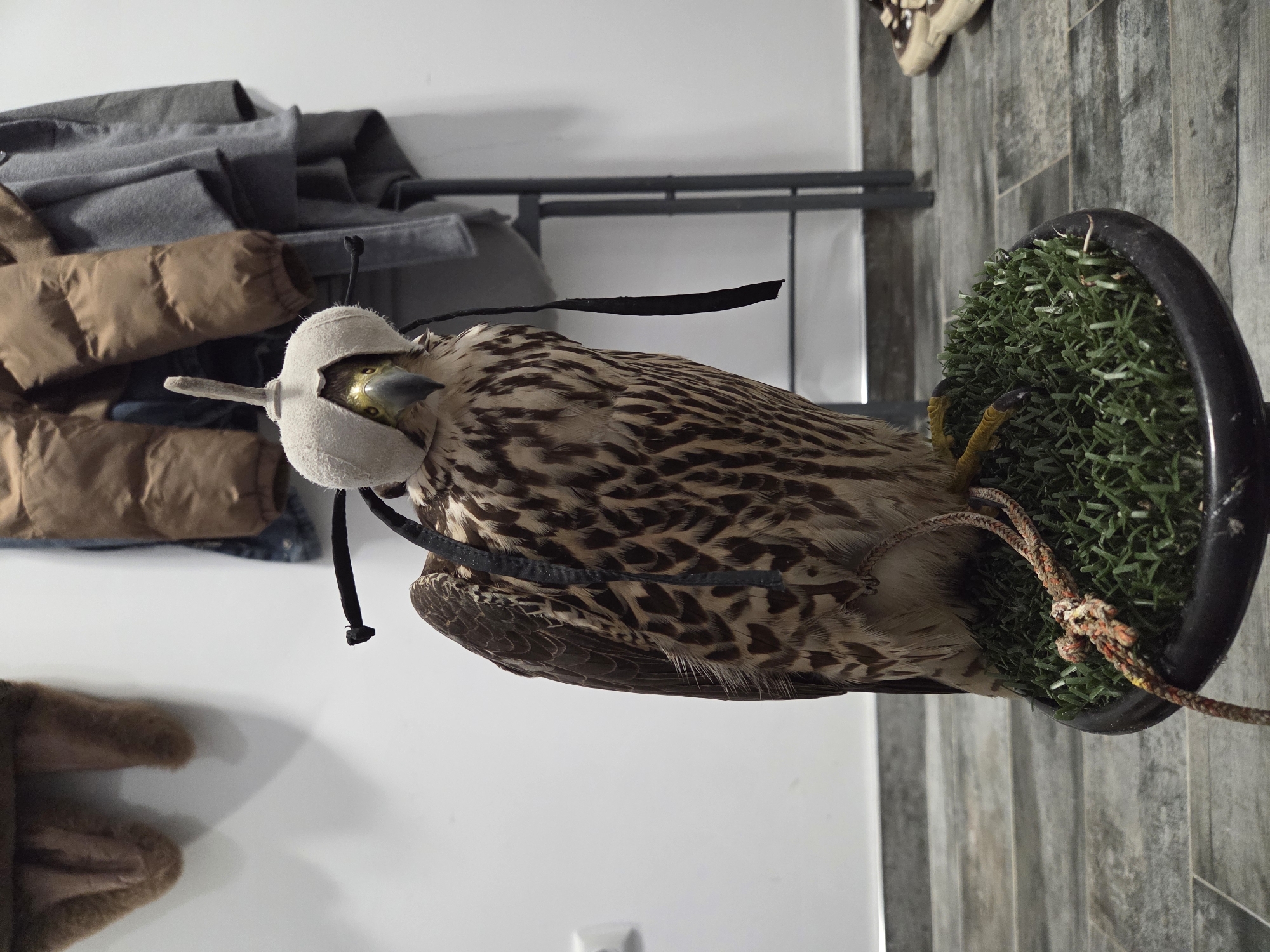 An indoor scene in Varna, Bulgaria, features a falcon perched on a stand