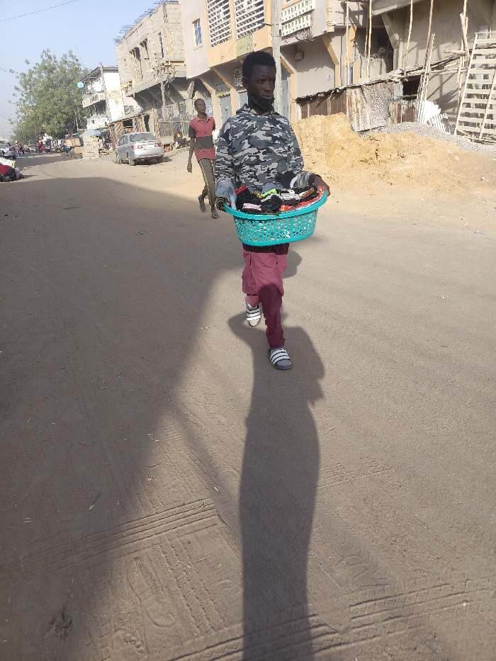 The image depicts a street scene in Sabon Gari East, Nigeria, under bright daylight. A male subject walks forward in the foreground, carrying a teal plastic basket filled with folded garments, likely socks, in both gloved hands. He is dark-skinned, wears a camouflage hoodie, maroon trousers, and black-and-white striped slides. A dark face mask rests around his chin. His elongated shadow is cast forward on the light brown, unpaved road, which exhibits tire tracks. In the mid-ground, another male walks down the left side of the road, wearing a red and black short-sleeved shirt and dark pants. The background features multi-story buildings lining both sides of the street; some structures appear residential, while others show signs of construction or disrepair, including visible scaffolding and piles of earth/sand on the right. A silver sedan is parked on the left side of the road, further back, near a large green tree. The sky is clear and light blue.