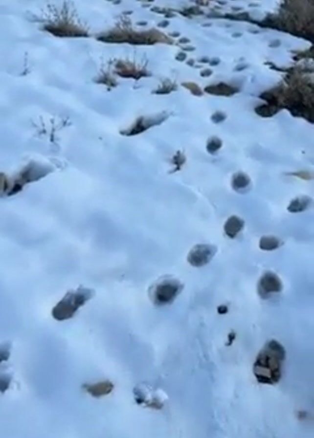 close-up view of a snow-covered ground with numerous footprints. The first-person perspective is looking down at a person's leg wearing light-colored pants and a gray and white sneaker stepping on the snow. The ground is uneven with some rocks and small patches of vegetation visible beneath the snow. The snow appears to be thin, with some bare patches.