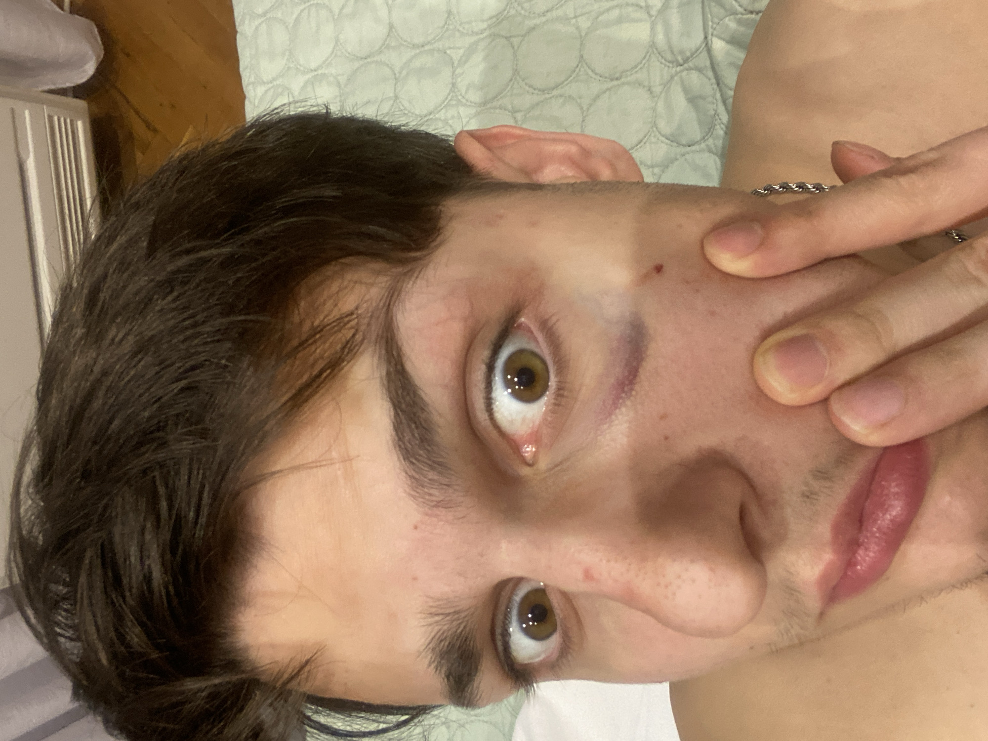 A close-up image depicts the upper torso and face of a young adult male, located indoors within the city of Varna, Bulgaria. The subject has dark brown hair, wide-set brown eyes, and appears shirtless, revealing part of his shoulders and neck, where a silver rope-chain necklace is visible on the right side. A prominent purplish-black bruise is visible under the subject's right eye (viewer's left), extending towards the upper cheekbone. A smaller, distinct reddish mark or scab is located on the outer part of the right cheek, below the eye. There is also a slight reddish discoloration on the bridge of the nose and a faint red mark near the inner corner of the left eye (viewer's right). The subject's left hand (viewer's right) is raised, with fingers pressing against the lower right cheek and jawline. His lips are slightly parted, showing a reddish hue, and faint facial stubble is discernible around the mouth and chin. The background primarily consists of a light green, quilted-patterned textile, likely bedding, positioned behind the subject and to the lower right. In the upper right corner, elements of an indoor room are visible, including a section of wooden parquet flooring, a white horizontal slatted fixture (possibly a blind or air vent), and a sheer white fabric.