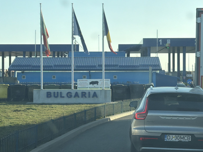 The image displays the entrance to the Bulgarian border crossing from Calafat, Romania, under a clear daytime sky