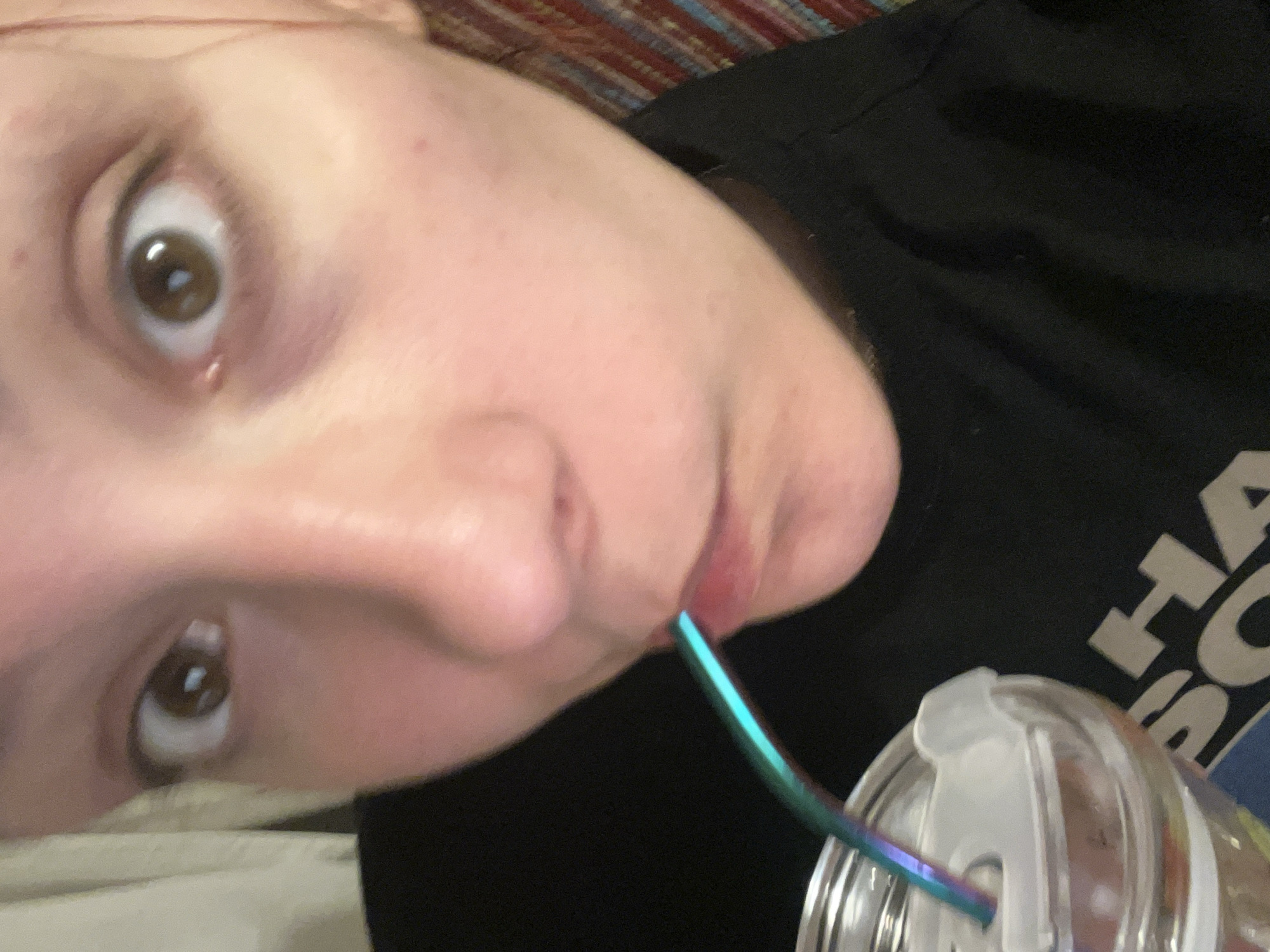 A tilted close-up shot shows a person with fair skin and brown eyes looking wide-eyed toward the upper left. A rainbow-colored straw is positioned between their lips, extending into a clear, lidded cup. The person is wearing a black t-shirt with visible white and blue lettering. The background consists of a multi-colored, striped surface. No information is available to determine the location of the scene in Sofia, Bulgaria.