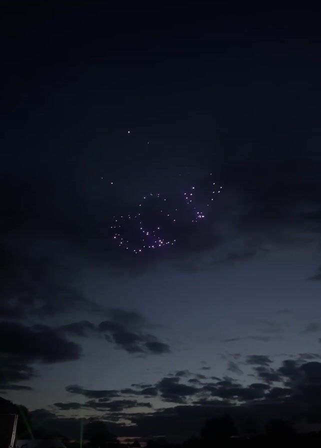 This video captures a night scene featuring a coordinated drone light show. In the dark sky, a formation of drones emits pink lights, creating a distinct shape resembling an insect or abstract design. Below the aerial display, there's a silhouette of trees and possibly buildings against the horizon. A crowd of people can be seen in the foreground, their shapes indistinct in the darkness, observing the display. The camera angle is low, looking up at the sky, and the overall atmosphere appears to be that of a public event. A voice, presumably from a recording or speaker, can be heard.